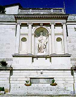 1817; fu terminata perō solo nel 1834. E' formata da un prospetto neoclassico impostato su un alto basamento a bugne regolari. L'alzato č composto da un ordine di quattro colonne ioniche, connesse da una trabeazione ed un cornicione che risalta nettamente dal prospetto. Sopra il cornicione č posta una balaustrata. Completano ai lati due ali piene lavorate a bugnato appiattito. Al centro la statua di Mosč (19k), del 1831, opera di Gaetano Monti di Ravenna, con una verga in mano nell'atto di far scaturire l'acqua dalla rupe del monte Oreb. Non fu mai completata nel suo progetto originario. |